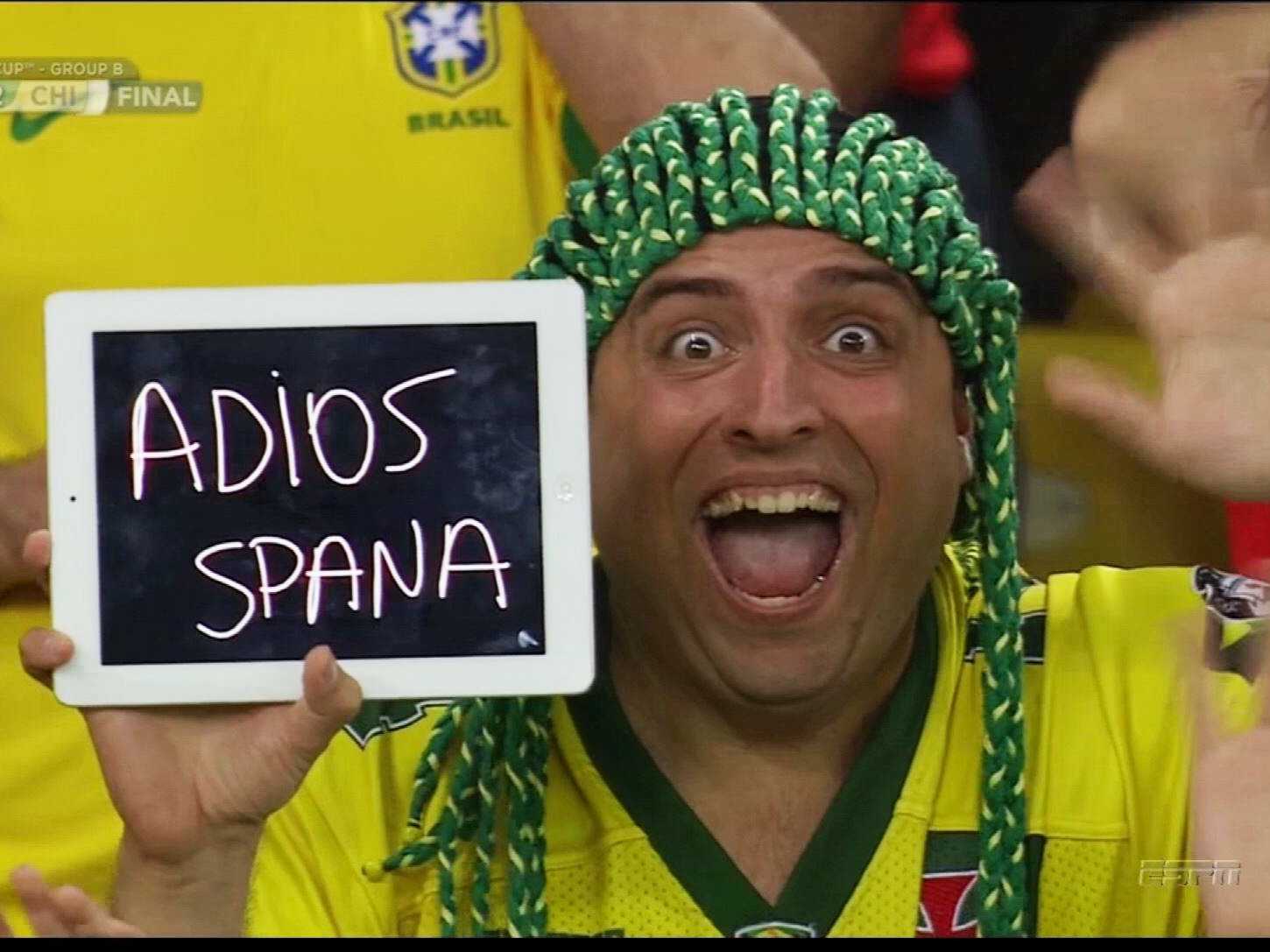 A Brazilian fan was spotted holding up his iPad with ‘Adios Spana’ written on it during Spain’s second World Cup loss on Wednesday to...