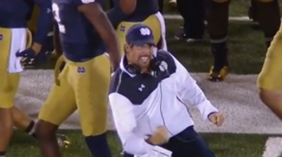 Notre Dame’s defensive coordinator Brian Vangorder wins this weekend’s best celebration during the Irish’s blowout victory over Michigan on Saturday.