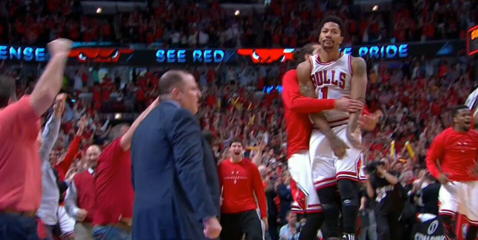 Take a look at this slow-mo video via Bill Wennington from inside the United Center of Derrick Rose’s buzzer-beater three during Game 3. https://twitter.com/34billy42/status/596876371701473280...