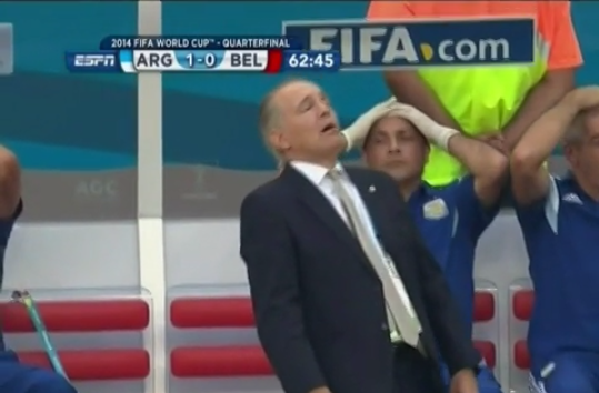 It looks like Argentina’s head coach Alejandro Sabella thought that some one might behind him to catch him if he leaned back in agony...