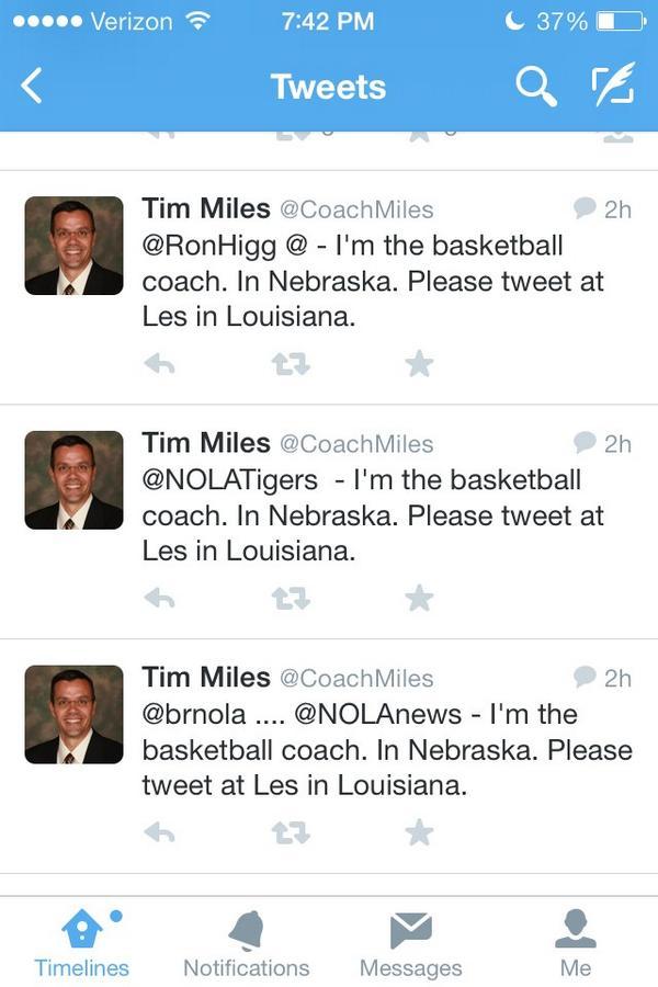Nebraska head coach, Tim Miles, who is famous for his Twitter usage during halftime of games, would like to let LSU fans know that they’re confusing him for Les Miles. What a polite guy this Tim Miles guy is.