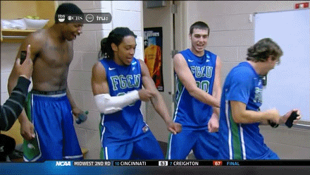 After pulling off the 12-5 overtime upset over Oklahoma, the North Dakota State players were ready to let loose when they arrived in the team’s locker room after the game.  With coach Saul Phillips’ Bison Horn celebration, its really hard to not like this team and think back to last season’s Florida Gulf Coast Elite 8 run and terrific post-game parties: