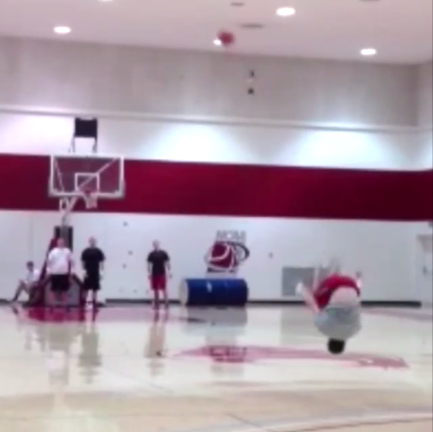 Kevin Nebeker of the Washington State Cougars cheer squad must have practiced this ridiculous shot many times.  Making a 3/4 court shot while doing a backflip is absolutely insane.