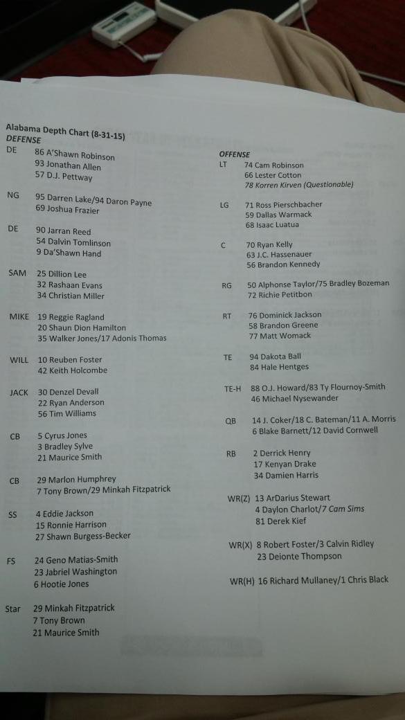 Alabama Alabama Releases Depth Chart For Wisconsin Game Published August 31, 2015 Alabama put out its official depth chart for this weekend’s game against Wisconsin. Take a look below. [click on image to expand] [Ben Jones] In this article:Alabama Football Recent Posts Former Michigan Coach Hired By Notre Dame To Join Staff No. 1 Player In Michigan Could Be Heading Elsewhere, Trending To Top B1G Program Michigan Tending To Land Specialist After Change In Recruitment Michigan Primed To Land Multiple Top 2026 Recruits Upcoming? Michigan Loses Out On Transfer Portal Target From A Rival