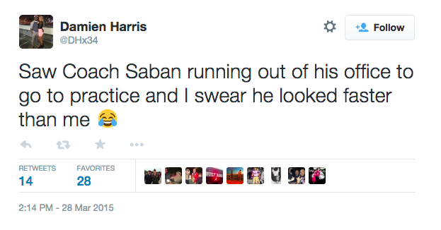 2015 recruit Damien Harris may have a hard time seeing the field this year with Derrick Henry and Kenyan Drake in-front of him. However, the five-star recruit of Kentucky will certainly get his chance. Harris tweeted about coach Nick Saban running out of his office to today’s Alabama practice. Saban’s apparently excited to get things rolling.