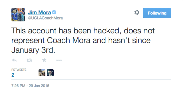After a high-profile incident at the Alamo Bowl between Jim Mora Jr. and coaching legend Bill Snyder, Mora went off on a twitter rant and then deleted his twitter account. A few weeks later, he came back to twitter but on a private account. Then Mora went back to his original account and accidentally tweeted at a recruit and was quick to use the most overused excuse ever.