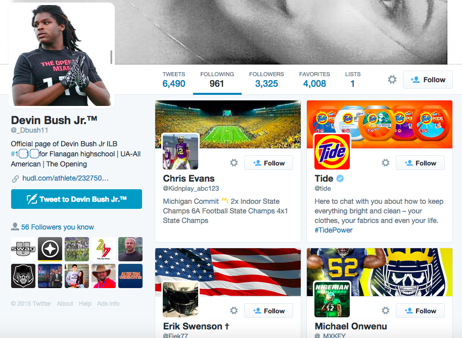 Devin Bush Jr., a four-star linebacker out of Flanagan High School, has two of his teammates already committed to the Wolverines (safeties Devin Gil and Josh Metellus). Bush, who previously took a selfie in a Michigan visor, has apparently been paying close attention to Wolverine’s 2016 class.