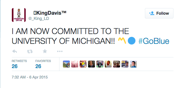 RB/FB Kingston Davis is the third commitment for Michigan from this weekend’s large group of visitors who were in Ann Arbor for the Spring Game. Davis, a three-star prospect out of Pratville, Alabama, is the Wolverines’ 5th commit for the 2016 class.