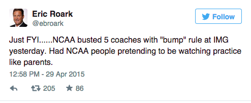 The IMG Academy in Florida has several highly sought-after football recruits in the 2016 class and the NCAA is watching them closely. According to UTSA assistant Eric Roark, five college coaches were busted by the NCAA for breaking the ‘bump’ rule. Roark’s tweet has been deleted: