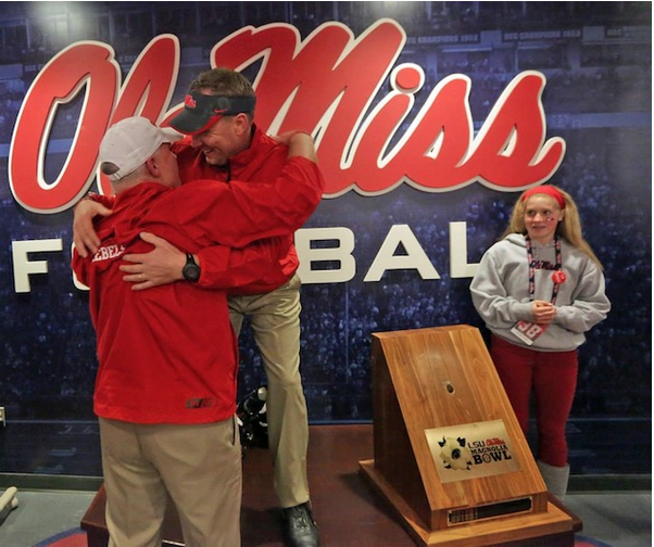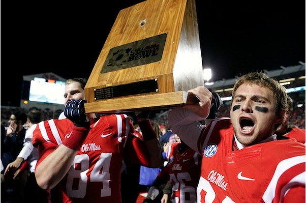 The Ole Miss Rebels upset the #6 LSU Tigers with a game-winning field goal as time expired on Saturday night. It was the Rebels first Magnolia Bowl win and they were extremely excited to get their hands on the Magnolia Bowl Trophy. Shortly after getting their hands on the trophy, they managed to break off the gold-plated Magnolia flower that was on the trophy. No word on whether the trophy has been fixed since the game ended, but something tells me the Rebels aren’t too concerned.