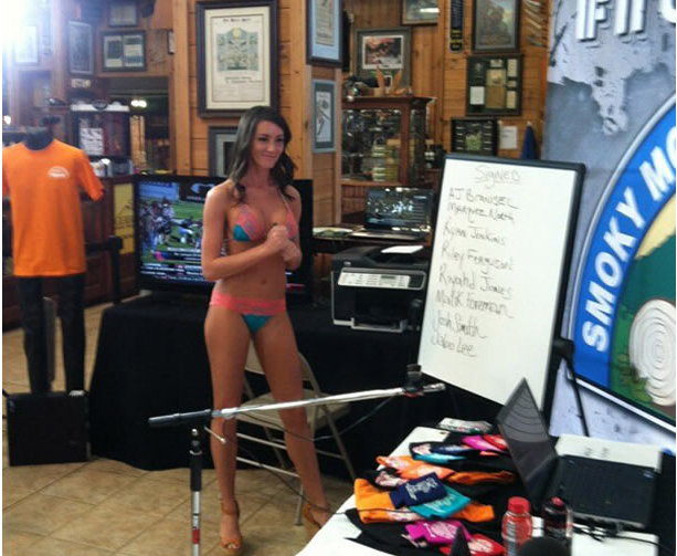 It wouldn’t be National Signing Day without a team from the South doing something ridiculous. Last year, the Alabama Crimson Tide had a girl in a skimpy skirt working their fax machine and updating their recruiting board with whose letters they had received on their webcast. Which led to the Tennesse Sports Radio having a fax cam girl as a spoof of the Alabama Crimson Tide fax cam girl, for the Tennessee Volunteers recruiting class. They hired a lingerie model for the day updating their board as the Letters of Intent rolled in.