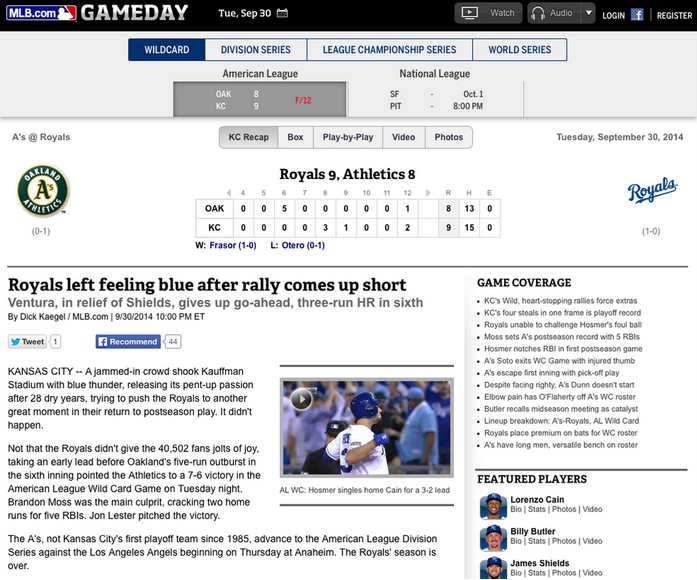 Looks like the MLB website was a bit confused as to who won the Royals-A’s game. Looks like they should have double-checked that title before hitting publish. It has since been changed.