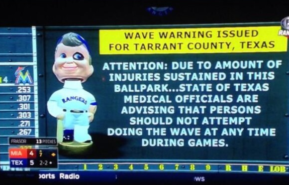 The Texas Rangers really do not want their fans doing the wave during games, going so far as to warn fans about the potential injury harm of doing it. During their game last night, the Rangers gave a PSA announcement advising against performing the wave, saying “Due to amount of injuries sustained in this ballpark….State of Texas medical officials are advising that persons should not attempt doing the wave at any time during games.” Well that’s a party foul.