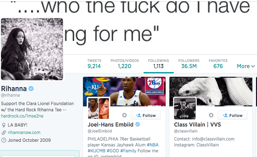 NBA Joel Embiid’s Efforts Pay Off, Rihanna Now Following Him On Twitter Published July 25, 2014 Looks like all that hard work shouting out to Rihanna on Twitter by 76ers rookie center Joel Embiid is paying off. It was spotted this afternoon that the singer had followed back the Nigerian native. In this article: Recent Posts Former Top Michigan Signee Is Headed To A College Football Playoff Team Michigan Loses Another Signee Following Sherrone Moore’s Firing Michigan Signee Vying For Current Staff Member To Be Next Coach Five-Star Michigan RB Savion Hiter ‘Likes’ Idea Of Wolverines Adding This Coach Michigan Loses First Member Of 2026 Recruiting Class After Sherrone Moore’s Firing