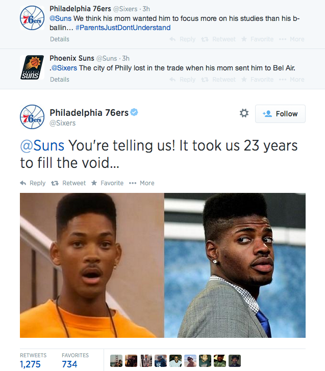 There really need to be more Twitter exchanges between pro sports teams like this. This is utterly priceless. Comparing Nerlens Noel to Will Smith with the high top fade is amazing.