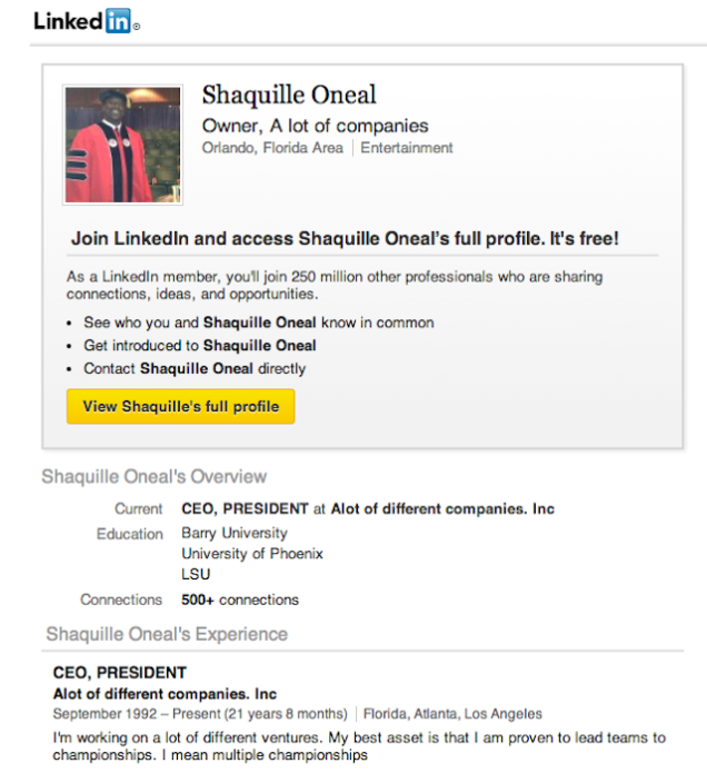 Shaq’s LinkedIn Profile has been uncovered. For his work experience, Shaq included “CEO-a lot of different companies–I’m working on a lot of different ventures. My best asset is that I am proven to lead teams to championships. I mean multiple championships.” Too perfect.