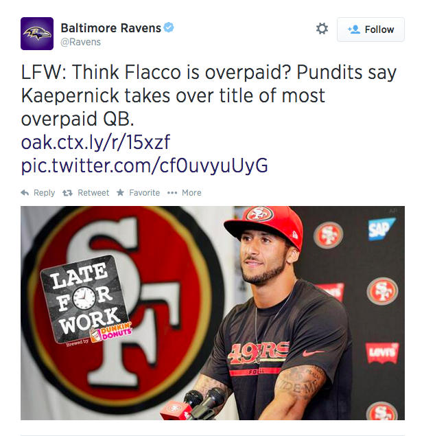 Baltimore Ravens Twitter Account Calls Colin Kaepernick Overpaid