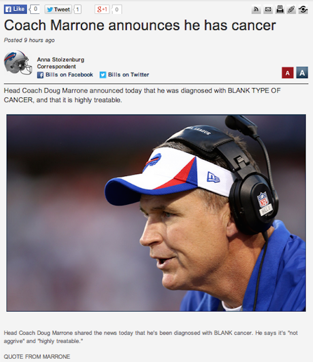 With something as serious as this, you would think that the Buffalo Bills official website would be just a bit more careful when publishing this tory. The Buffalo Bills announced head coach Doug Marrone does/did have a cancerous mole on his skin and it has since been removed.
