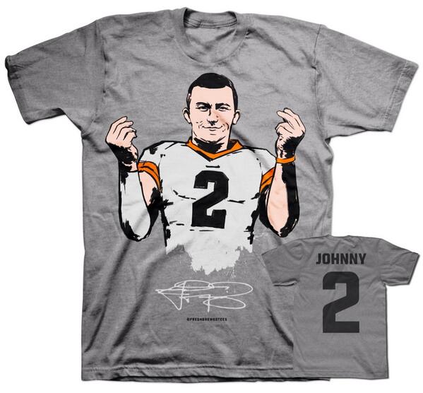 Fresh Brewed Tees, a Cleveland based shop, is selling (for $25.99) a Johnny Manziel tee shirt in which JFF is doing the money sign gesture. This is the second shirt the company has done of the Browns recent No. 22 pick, the first being just a head shot of Manziel: