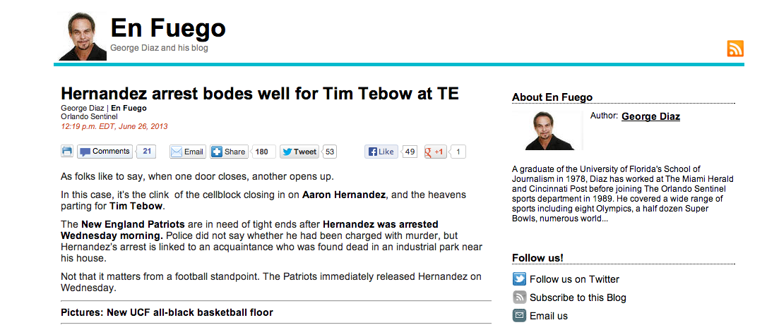 George Diaz of the Orlando Sentinel decided it would be a good idea to write an article about how Aaron Hernandez’s arrest is good news for Tim Tebow at tight end rather than address the seriousness of Hernandez’s case. Yet again, Tebow finds his way into the media spotlight, despite it not being necessary. The New England Patriots have already said that they see Tebow as a quarterback, yet people seem to still insist they will move him to tight end. Sure, it’s an option now that Hernandez has been arrested, and could have been a part of Bill Belichick’s master plan all along, but don’t think for a second that Tebow could replace Hernandez. Hernandez would have been a good teacher for Tebow, and now he’s not going to be there to help the learning curve if Tebow does study at tight end. You can read the whole article here.
