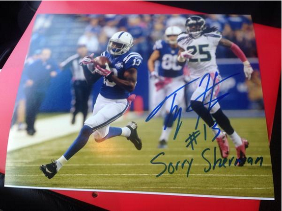 Looks like the young Indianapolis Colts wide receiver has a very good sense of humor. T.Y. Hilton clearly remembers his monster game against the Seattle Seahawks (140 yards and 2 TDs) and as a bonus, the fan who got this pic also got an epic photo mocking the “Fail Mary.”