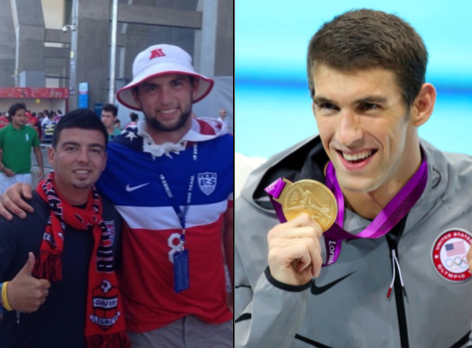 Indianapolis quarterback Andrew Luck is spending some of his offseason in Brazil and was in attendance for Tuesday’s United States-Belgium match. As big as the former two-time Heisman runner-up is in America, soccer fans are still mistaking him for other popular American athletes. One fan, the guy on the far left, Instagramed the above photo of himself and Luck, captioning it, “it’s a total #teamUSAeffort. Including the swim team. MP in the house!”