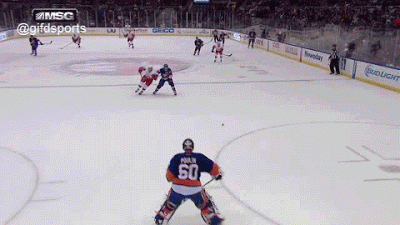 Detroit Red Wings forward Darren Helm has been on a tear since returning from injury and has now scored 7 goals in his last 13 games, two of which came against the New York Islanders on Friday. During the second period the Red Wings were shorthanded and Helm went after the puck while Islanders goalie Kevin Poulin tried to play it. Helm got to the puck first and poked it by Poulin and then collided with him, going flying through the air and losing his stick. The puck managed to find its way into the net and the Red Wings went on to win 5-0.