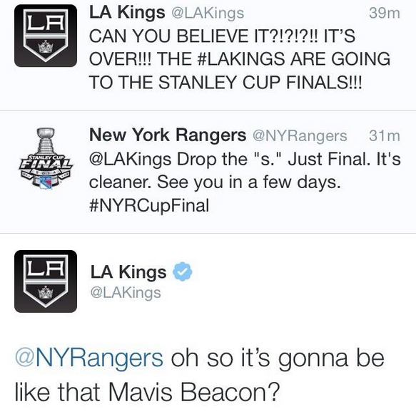 Shortly after the Los Angeles Kings beat the Chicago Blackhawks in overtime of Game 7, the New York Rangers and Kings Twitter Account’s started beefing. If this is any indication, this is going to be a very fun Stanley Cup Final.