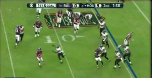 This was one of the better RB passes you will see all year. Arian Foster showed off some perfect patience waiting for the Ravens...