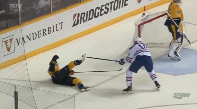 Good thing Nail Yakupov somehow managed to escape without a tripping penalty on this play. [NHL]