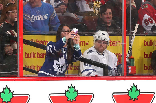 This may be the best selfie in the history of sports. A brave girl went down to take a selfie with Phil Kessel while...