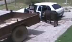 The definition of cutting it close. Watch as a guy steals a cow in his hatchback car in Russia.