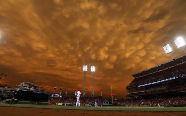 At last nights Reds-Cubs game, an ominous flame-looking sky was spotted. Is Cincinnati burning?? [Pic: Jeff Swinger, H/T Guyism]