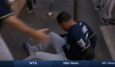 After grounding out in the fourth inning, the Brewers’ Carlos Gomez found himself in a bit of trouble, completely slipping down the dugout steps...