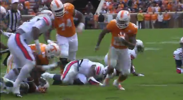 Tennessee Volunteers running back Rajion Neal did his best to imitate Marshawn Lynch on this run, breaking a few of tackles to stay up...