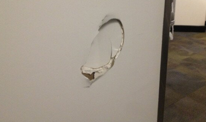The hole in the visitor locker room wall, courtesy of Denver's Kenneth Faried. http://t.co/XM6CrYd6JL — Sam Amick (@sam_amick) April 29, 2013 Nuggets forward Kenneth...