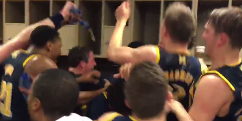 Michigan forward Kam Chatman earned this celebration with his Michigan teammates after sinking Indiana with a three-pointer at the buzzer in the Big Ten...