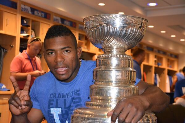 Yasiel Puig is certainly a character, so it was only right that he threw up ‘deuces’ when posing with the Stanley Cup on Tuesday....