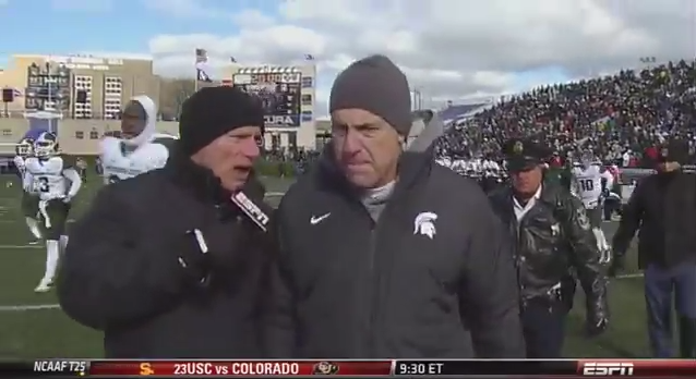ESPN sideline reporter Quint Kessenich went to ask Michigan State Spartans head coach Mark Dantonio a question prior to halftime but the first question...