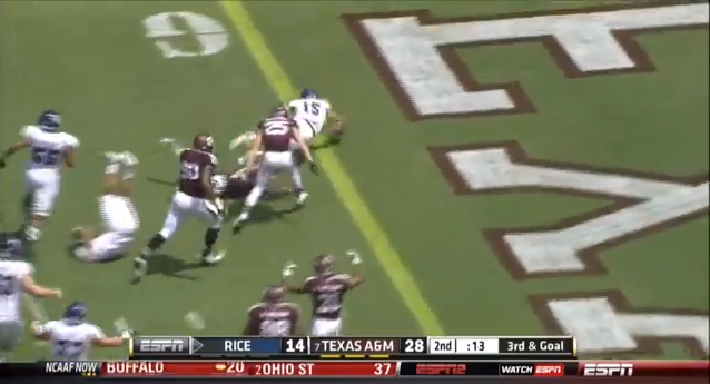 Rice Owls wide receiver Jordan Taylor caught a ball that was deflected by a Texas A&M Aggies defensive back and managed to take it...