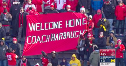 A ‘Welcome home Coach Harbaugh’ sign was spotted at the end of Ohio State’s blowout win over Michigan on Saturday. https://twitter.com/11W/status/670699750581215233/photo/1