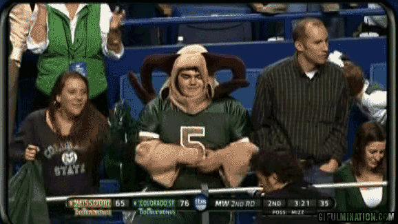 The young fan was shown twice by TBS’ TV crew during Colorado State’s game against Missouri during the NCAA tournament. Let’s hope he brings the enthusiasm (and costume) for CSU’s next game against No.1 seed Louisville.