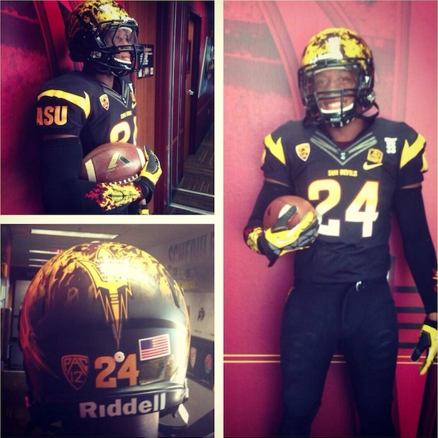 The Arizona State Sun Devils unveiled these special helmets for their Shamrock Series with the Notre Dame Fighting Irish and they are strange. The three pitchfork logos, coupled with the fireballs makes for one unique helmet, but a strange one at that. The helmet they wore last week looks better than this helmet and they would be better off wearing that, in my opinion.