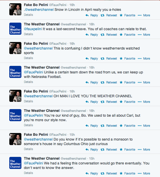 Faux Pelini is one of the best Twitter parodies to follow and last night, he and the Weather Channel had a fantastic exchange. That first response from TWC about the last second heave is truly a gem.