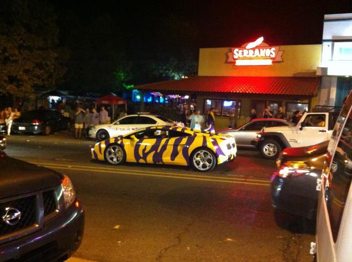 Earlier in the week a photo was posted on reddit’s WTF page by a man working in a body shop and painting purple tiger stripes on a yellow Lamborghini Gallardo. LSU heard about the car and had a photo posted to their Facebook page. It was later found by another reddit user on the street, only to show that this man wanted to put his fandom on complete display.