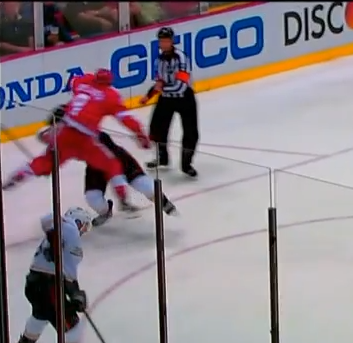 The Detroit Red Wings forward Justin Abdelkader was ejected for this hit on Anaheim Ducks defenseman Toni Lydman during the second period of game three.  It was a close-checking tie game and this hit seemed to change the whole series in favor of the Ducks.  Lydman was knocked out of the game with a possible concussion and Abdelkader was given a five-minute major for charging and a game misconduct.  The Ducks went on to dismantle the Red Wings by a score of 4-0.