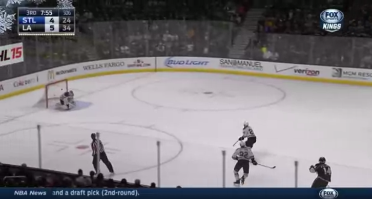 Talk about some bad bounces, my goodness. Dwight King let one rip from center ice on Martin Brodeur and with one brutal hop, this puck went from harmless dump in to a goal. That thing bounced like a frigging super ball and Brodeur was furious.