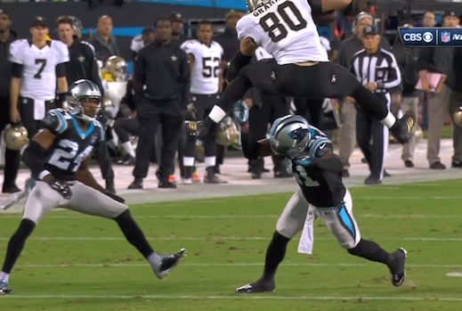Jimmy Graham is 6’7″ 265 lbs, but that didn’t stop him from leaping over the 6’1″ Roman Harper. Just an absolutely incredibly athletic play....