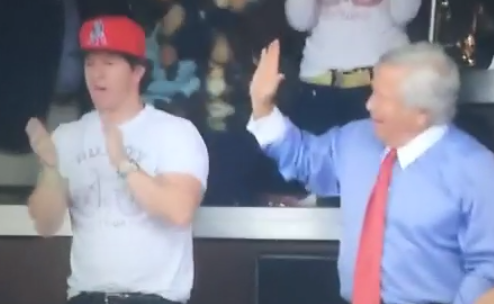 Following a Rob Gronkowski touchdown, Patriots owner Robert Kraft went to give Mark Wahlberg a high five. Too bad Wahlberg was paying too much...