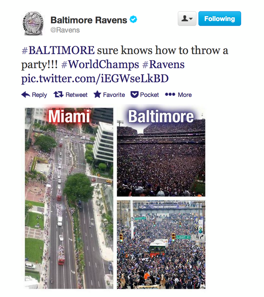 Social media shots fired today. The official Baltimore Ranens twitter account sent out this twitter jab at the Miami Heat’s Championship parade today. Boom....